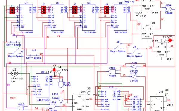 上电后,首先将开关J6接至高电平,随后拨动J7产生时钟脉冲,使74LS194D芯片完成并行置数操作。之后将J6切换为低电平,触发74LS194D进入右移工作模式。
