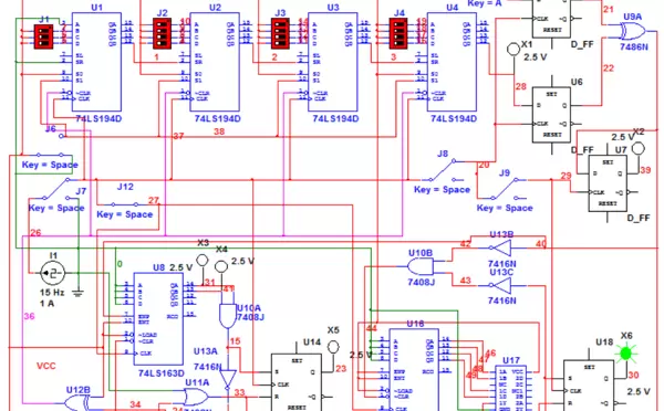 - 采用四个74LS194双向移位寄存器组成15位串行数据缓存与比较结构。