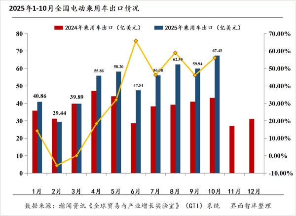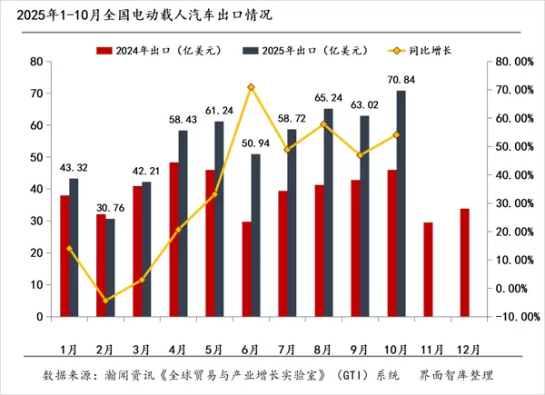 根据界面智库与瀚闻资讯联合统计,2025年10月,中国电动载人汽车贸易延续结构性分化态势,整体增长动力进一步强化。进口方面持续收缩,国内市场对海外产品的依赖度不断下降,进口规模同比仍处于显著下滑区间;而出口则展现出更强韧性与增长潜力。当月出口总额达70.84亿美元,同比增长54.26%,环比上升12.41%;出口数量为37.50万辆,同比大幅增长68.70%,环比增加8.61%。2025年1-10月累计出口量已达297.36万辆,同比增长56.60%,增速较前9个月扩大1.45个百分点,表明全球市场拓展势头稳健向好。