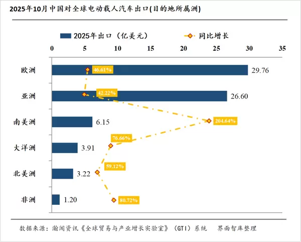 从大洲维度观察,我国电动载人汽车出口正逐步形成“成熟市场稳盘托底、新兴市场提量增效”的双轮驱动模式。在成熟市场方面,亚洲和欧洲持续发挥“压舱石”作用。亚洲覆盖49个出口市场,10月出口额达26.60亿美元,同比增长42.22%,构成出口的核心基础;欧洲市场表现突出,在覆盖39国的情况下实现29.76亿美元出口额,同比猛增46.61%。