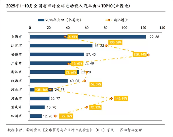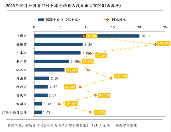 在地域分布上,2025年1-10月,上海、江苏、安徽三地继续稳居电动载人汽车出口规模前三甲,合计贡献了全国近七成的出口总量,产业聚集效应显著。与此同时,不同区域间的出口增速呈现明显两极分化:部分东部沿海地区依托产业链优势实现高速增长,而一些中西部省份则面临增速放缓或负增长的压力,区域发展不平衡问题依然存在。