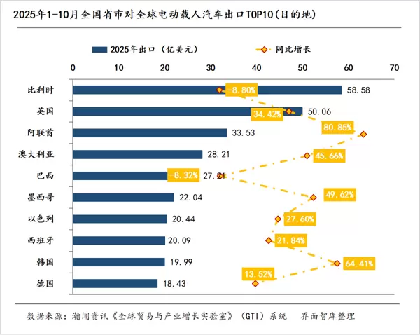 1–10月,中国电动载人汽车出口目的地中,比利时以58.58亿美元位居首位,同比下降8.80%;英国以50.06亿美元排名第二,同比增长34.42%;阿联酋以33.53亿美元位列第三,增幅达80.85%。出口额前十的目的地合计为298.57亿美元,占总出口额的54.82%。与1–9月相比,TOP10名单未发生变动,整体格局维持稳定。