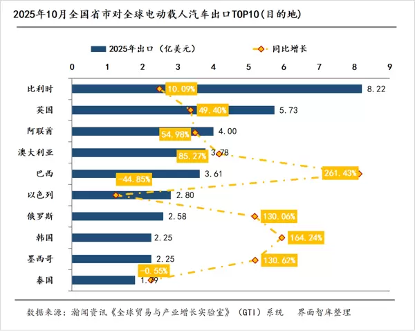 10月单月,中国对全球电动载人汽车出口同比增速最快的五大目的地依次为圭亚那、葡萄牙、阿根廷、捷克和瑞士。当月,对中国电动载人汽车出口实现同比增长的国家/地区达101个,出现同比下降的则有50个。