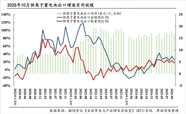 从结构占比来看,2025年1-10月,锂离子蓄电池、电动载人汽车和太阳能电池在“新三样”出口中分别占44.4%、38.8%和16.7%。与去年同期相比,锂离子蓄电池和电动载人汽车的比重分别提升了2.2和4.1个百分点,而太阳能电池则下降了6.3个百分点。