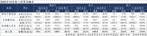根据界面智库与瀚闻资讯的统计数据,2025年1月至10月,我国“新三样”进出口总额达1458.7亿美元,同比增长18.1%。其中,出口额为1402.8亿美元,增幅为20.3%;进口额为55.9亿美元,同比下降19.4%。从单月数据看,2025年10月,“新三样”进出口总额为170.4亿美元,环比增长1.3%,同比增长31.7%。当月,在全国整体出口同比下滑的背景下,“新三样”出口实现逆势上扬,达到163.1亿美元,环比增长0.7%,同比增长32.1%;进口额为7.3亿美元,环比上升16.6%,同比增长22.6%。