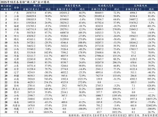 2025年10月,在全国31个省、市、自治区中,有24个省份的“新三样”出口金额实现同比增长,较上月减少3个。其中,10个省份同比增速超过100%。此外,有12个省份的同比增速较上月进一步加快,但加快的省份数量较9月减少了8个。