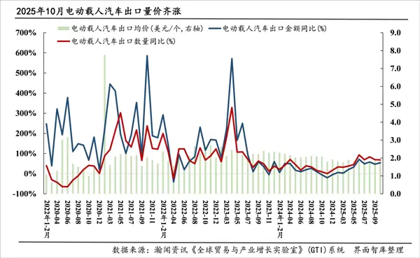 在具体产品表现方面,对美电动载人汽车出口量环比增长4.6%,但同比下降7.0%,导致当月对美“新三样”出口增速被拉低0.3个百分点。