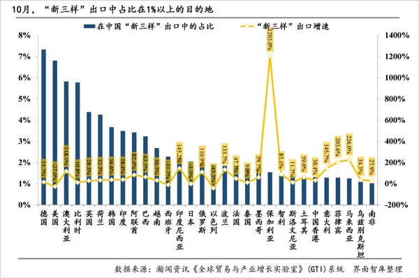从1-10月累计情况看,我国“新三样”出口目的地中占比超过1%的国家和地区增至29个。前十位目的地排名与9月一致。对累计出口同比增长贡献最大的依次为德国、澳大利亚、阿联酋、印尼、智利、英国、菲律宾,拉动幅度均超过1个百分点,其中德国贡献依然居首。
