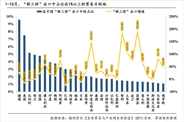 10月,“新三样”出口额前十的目的地依次为德国、美国、澳大利亚、比利时、英国、荷兰、韩国、印度、阿联酋、巴西,占比分别为7.3%、6.8%、5.8%、5.8%、4.4%、4.3%、3.7%、3.5%、3.4%、3.2%。与上月相比,德国、美国、英国排名不变,澳大利亚上升3位,韩国、印度各上升1位,巴西上升2位。