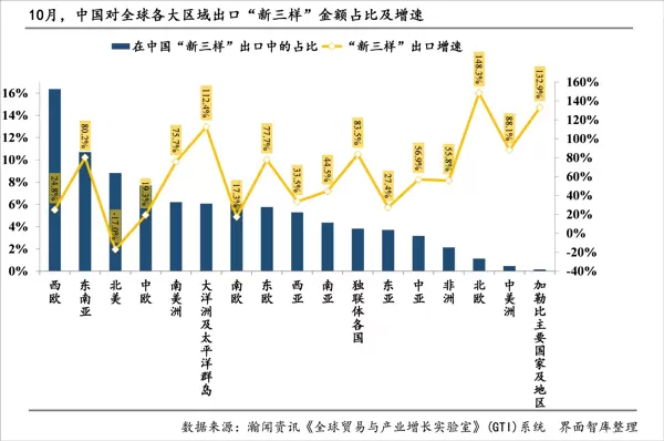 从区域维度看,东南亚仍是10月对“新三样”出口增长贡献最大的区域,拉动全国出口增长6.3个百分点,较上月减少1.6个百分点。当月对东南亚出口环比增长1.7%、同比增长80.2%,增速较9月分别回落0.9和35.3个百分点,在总出口中的占比微升0.1个百分点至10.7%。西欧仍为占比最高的主要区域,达16.4%。北欧表现尤为突出,10月对北欧“新三样”出口环同比分别增长102.2%和148.3%,拉动全国出口增长0.9个百分点,拉动幅度较9月提升2个百分点,为各大区域中增幅最显著者。