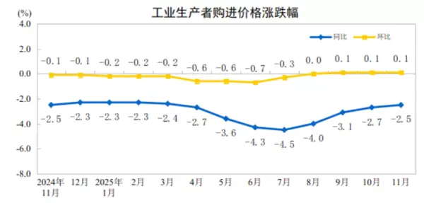 数据显示,2025年11月份,全国工业生产者出厂价格同比下降2.2%,购进价格同比下降2.5%。但环比方面,出厂价格与购进价格均上涨0.1%,涨幅与上月持平。2025年1至11月平均,工业生产者出厂价格较上年同期下降2.7%,购进价格下降3.1%。