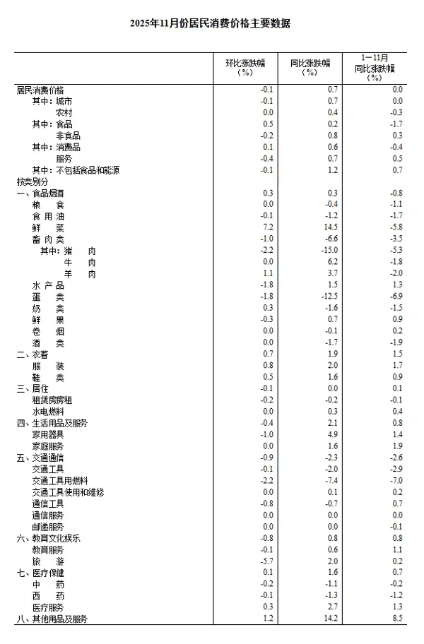 2025年11月份,全国居民消费价格同比上升0.7%。其中,城市地区价格上涨0.7%,农村地区上涨0.4%;食品类价格微涨0.2%,非食品类上涨0.8%;消费品价格上涨0.6%,服务类价格上涨0.7%。从累计数据看,2025年1月至11月,全国居民消费价格总水平与去年同期基本持平。