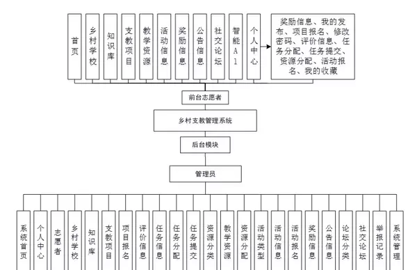 管理员作为系统的最高权限拥有者,负责维护系统的安全与正常运行,具备全部功能模块的操作权限,具体包括但不限于:志愿者管理、乡村学校信息维护、知识库管理、支教项目管理、项目报名审核、评价信息处理、任务信息发布与分配、任务提交记录查看、资源分类设置、教学资源上传、资源分配调控、活动类型定义、活动信息发布、活动报名管理、奖励信息登记、公告发布、论坛分类管理、社交论坛内容监管以及举报记录处理等功能。