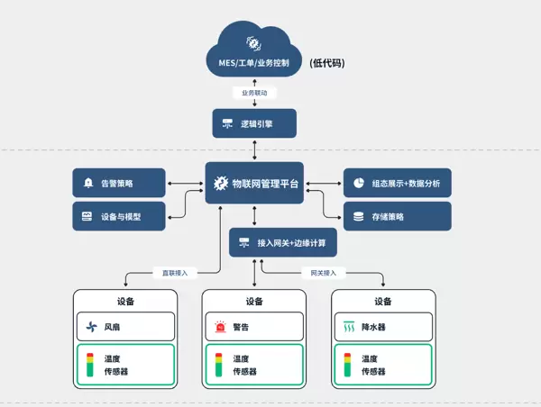 提供软件化的边缘网关与配置化物联网平台,能够与低代码、数据分析、逻辑引擎等功能联动,覆盖从设备数据采集、规则策略设定、业务联动触发到数据可视化分析的全流程配置化管理,技术生态完整,部署灵活高效。