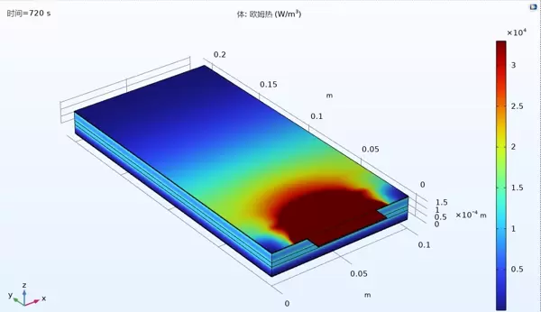 通过COMSOL Multiphysics平台,结合锂离子电池模块与传热模块,可实现对三维叠片式锂离子电池在充放电过程中多物理场的全耦合仿真。该模型能够准确捕捉欧姆热、极化热及反应热的产生过程,并进一步分析其引发的电芯内部温度演化规律。