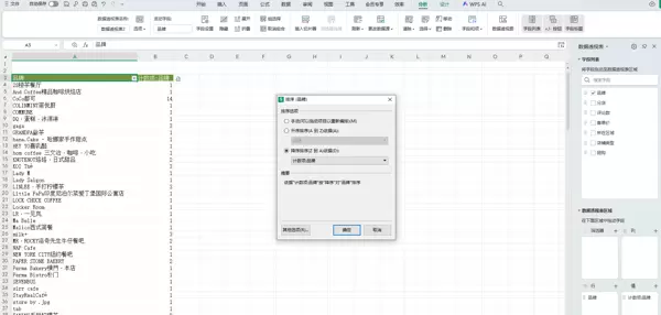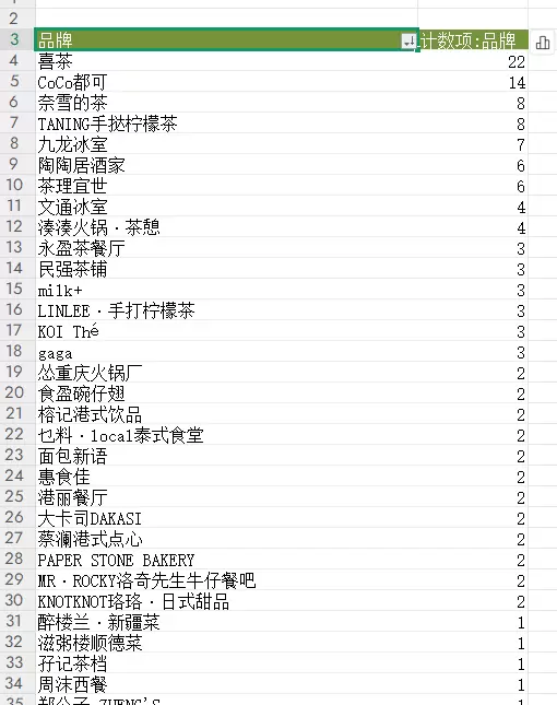 将品牌字段分别拖入“行”区域和“值”区域,即可统计各品牌的出现频次,并支持排序操作。