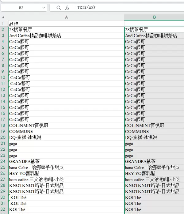 使用 TRIM 函数可以有效去除文本前后及中间多余的空格(仅保留单词间单个空格),从而标准化数据格式。