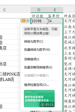 部分数字可能因导入问题被识别为文本格式,其左上角会显示小绿标,在参与计算时可能导致错误。