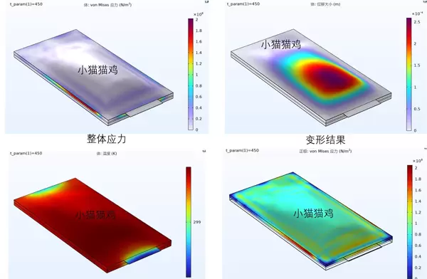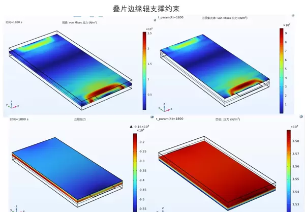仿真结果可输出电芯内部集流体、活性电极材料及隔膜等关键部件的应力分布、应变演化和压力变化情况。模型支持两种耦合方式:电化学-力单向耦合与双向耦合,适用于不同精度需求和计算资源条件下的研究场景。