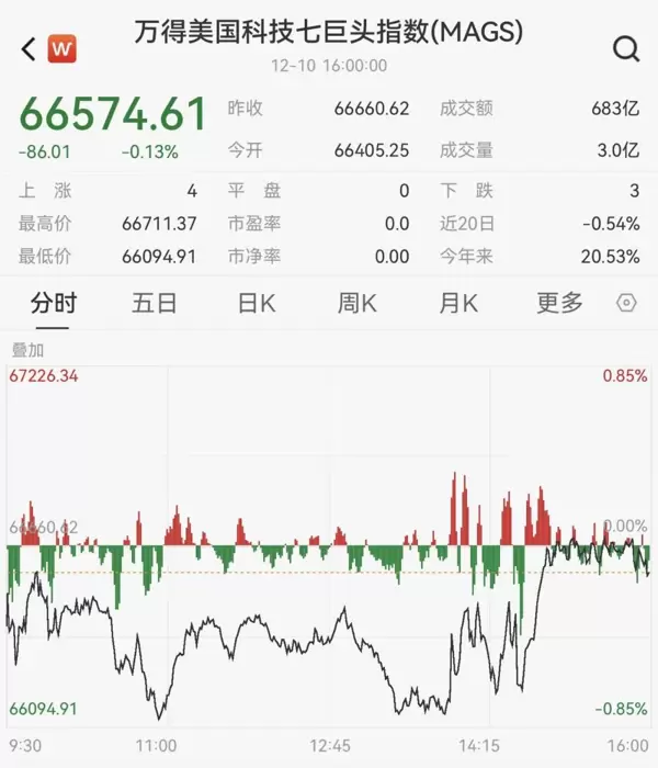 科技股走势分化,万得美国科技七巨头指数微跌0.13%。具体来看,亚马逊、特斯拉和谷歌涨幅均超过1%,苹果股价小幅上升;而微软下跌2.78%,Meta跌幅超过1%,英伟达也出现小幅回落。