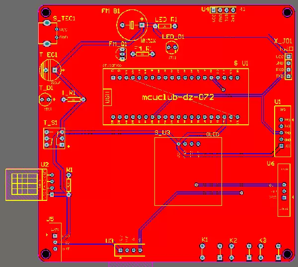 PCB由原理图导出生成,采用双层结构,整体覆铜并接地处理。大部分元器件封装由设计者自行绘制完成,不单独提供封装库文件,仅提供完整可编译的工程源文件。PCB中央位置设有一个项目编号标识,位于单片机底座下方,安装后会被遮挡不可见。