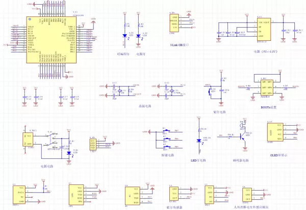 原理图基于AD2013软件绘制,采用网络标号方式进行电气连接标注。需注意:图中仅展示各功能模块的外部引脚连接关系,并未涉及模块内部详细电路结构。