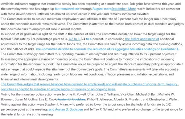 从投票情况来看,本次会议共有三名官员表达不同意见:堪萨斯城联储主席施密德和芝加哥联储主席古尔斯比主张暂停降息;而美联储理事米兰则坚持应降息50个基点。相较前次会议,倾向于维持利率不变的力量有所增强,表明委员会内部对于未来路径的分歧正逐步扩大。