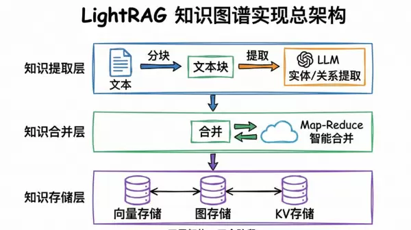 LightRAG 采用“三层架构 + 三个阶段”的整体设计思路,确保从原始文本到结构化知识图谱的转化过程高效且可控。每一层级与阶段均承担明确职责,并融入优化机制以提升处理效率与结果质量。