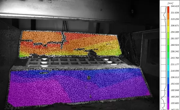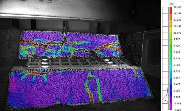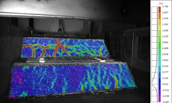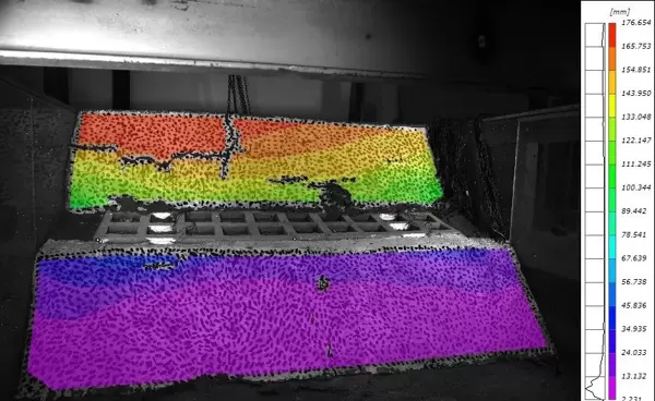 测量原理:在模型表面人工绘制随机散斑图案,利用DIC算法比对变形前后图像的像素变化,计算出全场位移并进一步求解应变场。