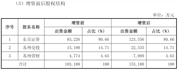 本次增资将按照现有持股结构进行注册资本认购。其中,东吴证券出资约4.03亿元,苏州交投出资7355万元,苏州营财出资2315万元。完成注资后,东吴期货的注册资本将从10.32亿元上升至15.32亿元,各股东持股比例维持不变。