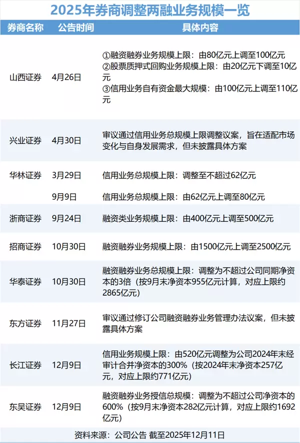 仅在11月以来的一个月内,已有3家券商宣布调整两融相关安排。就在12月9日当晚,长江证券也同步披露,拟将其以自有资金出资的信用业务规模上限由520亿元调整为2024年末经审计合并净资本的300%,为后续业务扩张预留空间;而早在11月27日,东方证券亦公告称,董事会已审议通过修订《公司融资融券业务管理办法》的相关议案。