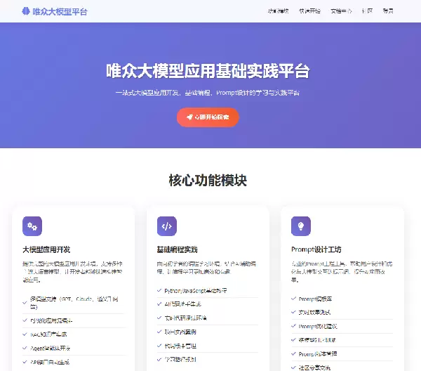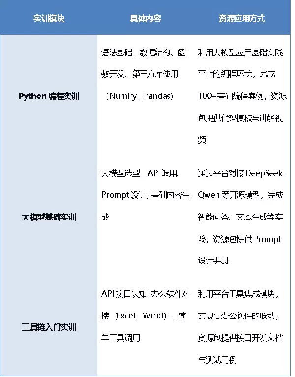主要目标:掌握智能体技术的基本理论和工具操作,重点培养编程基础、大模型应用等核心技能。 关键资源:唯众大模型应用基础实践平台、智能体技术基础资源包 实训内容与资源配置匹配