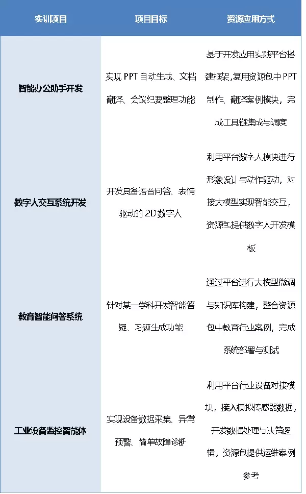 课程资源联合开发:校企合作编写《智能体开发实战》《数字人交互技术》等核心教材,融入真实企业案例。实训项目协同建设:围绕企业实际需求,共同开发不少于20个综合实训项目,形成“项目库—资源包—考核标准”一体化教学资源体系。