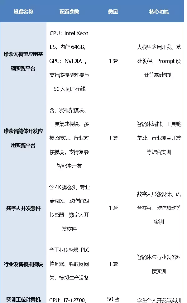 坚持“由浅入深、由模拟到真实、由单一任务到协同作业”的实训设计逻辑,建立“基础实训—综合实训—创新实训”三级递进式实训体系。将唯众的大模型应用基础实践平台、智能体开发应用实践平台、智能体技术基础资源包、离线智能体案例资源包深度嵌入各实训环节,确保“实训内容与产业项目同步、实训设备与生产工具同源、实训流程与工作流程一致”。2.2 建设目标