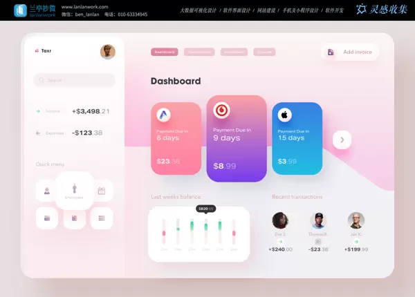 - 高频操作贴近行为路径:“Add invoice”按钮置于导航栏右侧,契合用户“查看数据后立即创建发票”的操作习惯;左侧“Quick menu”则以图标形式集成“员工管理、日历、文档”等常用功能,实现无需跳转的快捷访问;
