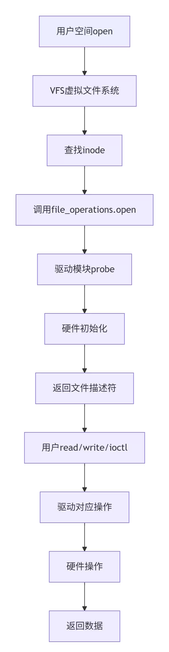 该结构确保了用户程序可通过标准系统调用(open/read/write/ioctl等)与底层硬件交互。