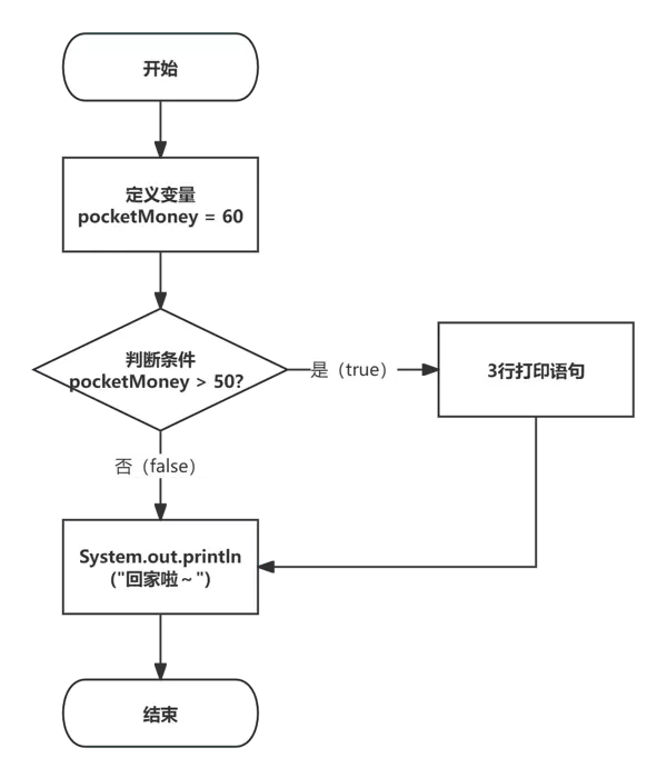 修改测试:若将 pocketMoney 设为 40,条件不成立,则不会输出购书相关语句,仅打印“回家啦~”。