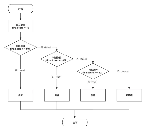 执行规则:自上而下逐个检查,一旦某个条件为 true,就执行对应代码块并跳出整个结构,后续不再判断。