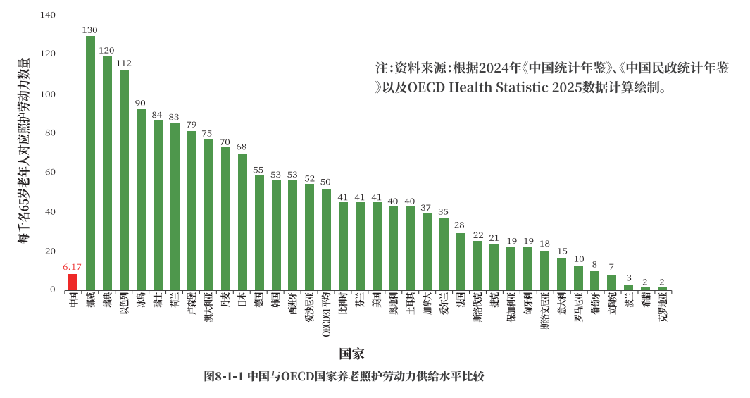 2023年我国每千名65岁及以上老年人平均仅对应约6.17名照护劳动力,远低于国际主流水平。报告显示,多数2023年经济合作与发展组织国家的照护劳动力密度普遍在每千名老年人40~120人之间,丹麦、挪威、瑞典等北欧国家甚至超过100人;即便是照护体系相对紧张的韩国、日本,其照护人力密度仍分别达到50人与53人,明显高于我国当前水平。