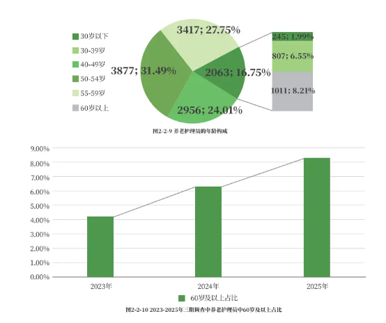 报告显示,老年护理员中40-59岁群体占比高达83.25%,60岁以上群体占比逐年上升。女性护理员占比高达89.25%,且在各年龄段均保持较高比例。30岁以下年轻护理员占比不足2%,且离职倾向近20%。