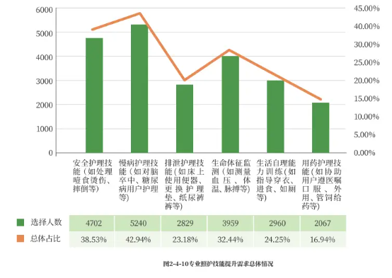 当前养老护理员的技能集中在基础生活照料,高级证书持有率仅16.01%,难以满足重度依赖老人增幅超28%的照护依赖结构升级需求。但养老护理员对慢病护理、安全护理、生命体征监测等技能的迫切需求,反映了他们自身对于提升护理技能专业度的意识。