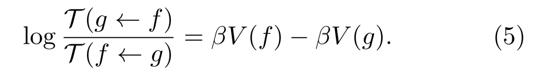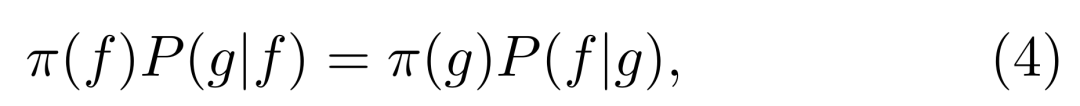 值得注意的是,如果 𝒯 描述的是一个平衡系统的转移,其状态转移满足细致平衡条件,即对于所有状态对 (f,g),下式成立: