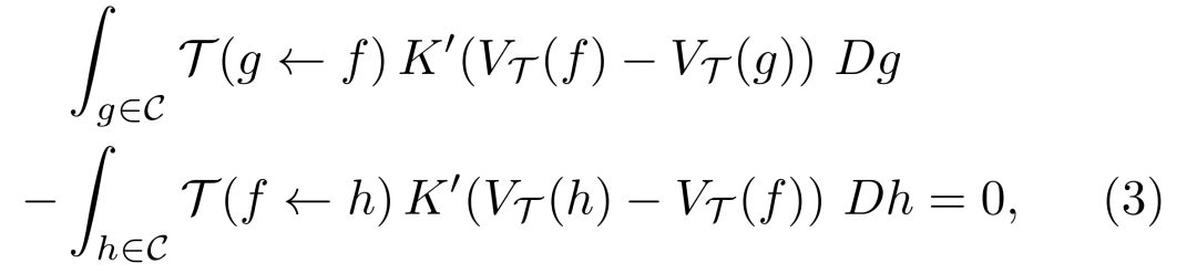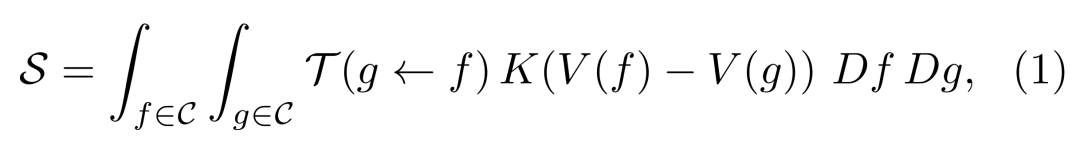 给定一个全局势函数 V,研究者将智能体的给定转移 𝒯(g←f) 对势函数的违背定义为 K (V (f)−V (g)),其中 K (x) 是一个凸函数,用于描述从状态 f 到状态 g 的转移在多大程度上违背了势函数 V 的排序。为了量化智能体行为与势函数之间的整体不匹配度,研究者以转移核 𝒯(g←f) 为权重,将作用量 𝒮 定义为全局平均违背: