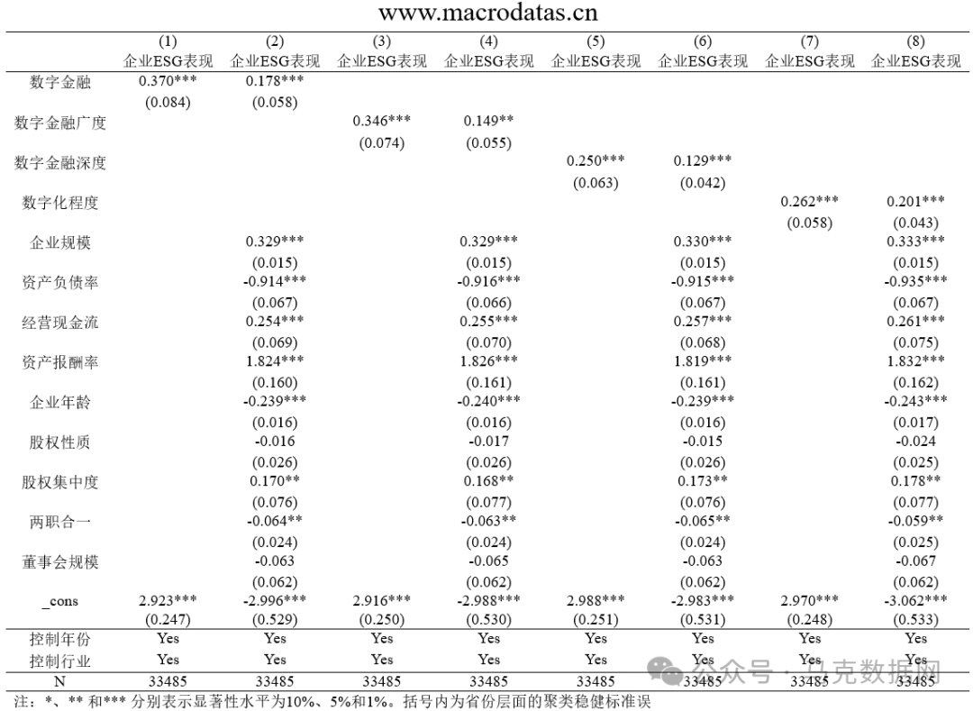 参照温亚东(2024)的研究方法,本团队复刻了《统计与决策》中《“漂绿”检验、机制与效应:数字金融对企业ESG表现的影响》一文(2011 - 2022年)的基准回归部分。企业ESG表现数据源于上市公司 - 华证ESG数据(点击查看),数字金融水平数据源于上市公司 - 数字普惠金融水平(点击查看)。