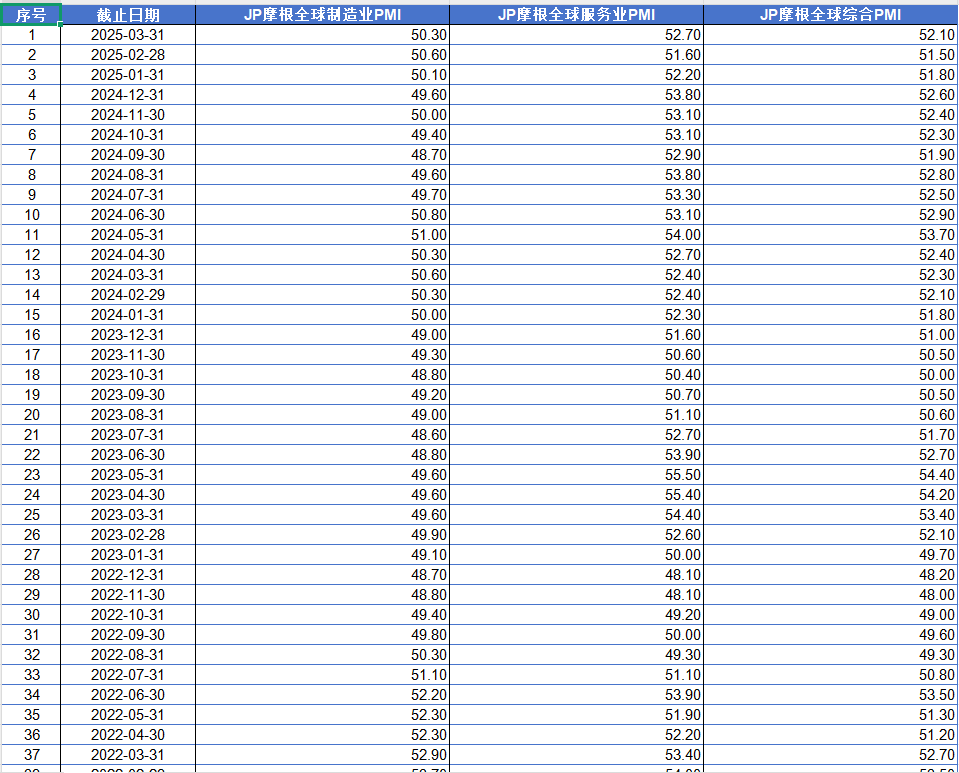 JP摩根全球PMI作为全球经济增长的“晴雨表”,涵盖三个关键指标,即JP摩根全球制造业PMI、JP摩根全球服务业PMI以及JP摩根全球综合PMI。这些指标是衡量全球制造业与服务业整体健康状况的重要参考,能够精准反映国际市场需求变化、企业经营活跃度以及全球经济的整体走向。