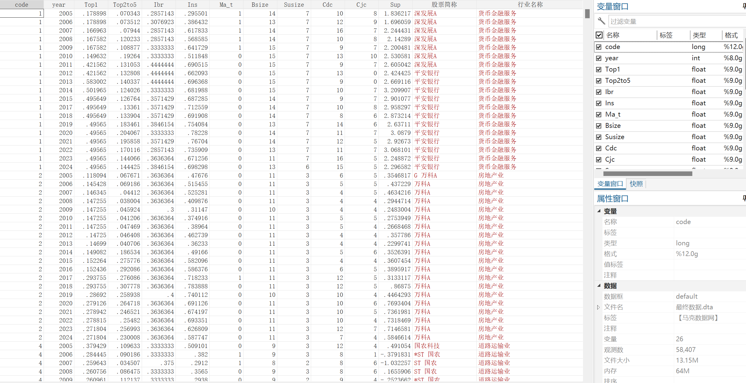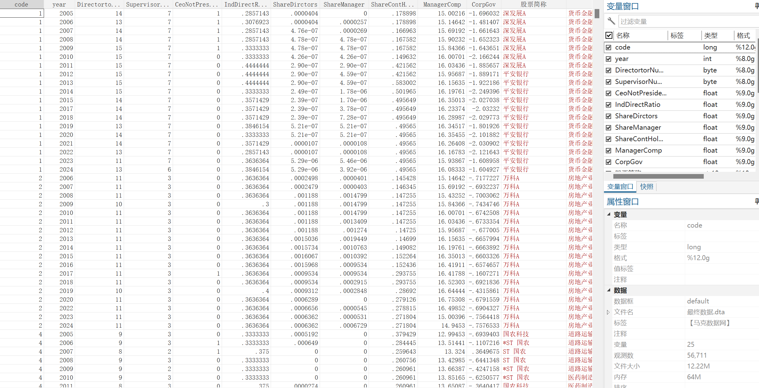 code | year | Dis | Sus | Mas | Pad | Pap | Masa | Inc | 股票简称 | 行业名称 | 行业代码 | 所属省份 | 所属省份代码 | 所属城市 | 所属城市代码 | 是否stpt | 是否金融 | 是否制造业 | 是否沪深上市 | 成立年份 | 上市年份 | Top1 | Top2to5 | Ibr | Ins | Ma_t | Bsize | Susize | Cdc | Cjc | Sup | DirectortorNumb | ShareDirctors | ShareManager | ShareContHolder | SupervisorNumb | CeoNotPresident | IndDirectRatio | ManagerComp | CorpGov |