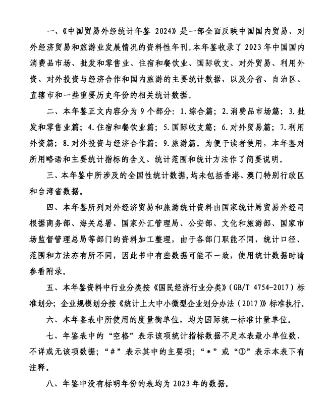 报告年份:1990-2024年,年份无缺失数据年份:1989-2023报告来源:国家统计局贸易外经统计司内容格式:每年都有 PDF+Excel《中国贸易外经统计年鉴》是一部全面反映中国国内贸易、对外经济贸易和旅游业发展情况的资料性年刊。本年鉴收录了中国国内消费品市场、批发和零售业、住宿和餐饮业、国际收支、对外贸易、利用外资、对外投资与经济合作和国内旅游的主要统计数据,以及分省、自治区、直辖市和一些重要历史年份的相关统计数据。