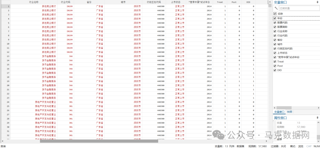 三、数据指标[td]年份 | 股票代码 | 股票简称 | 行业名称 | 行业代码 | 省份 | 城市 | 行政区划代码 | 上市状态 | “宽带中国”试点年份 | Treat | Post | DID |