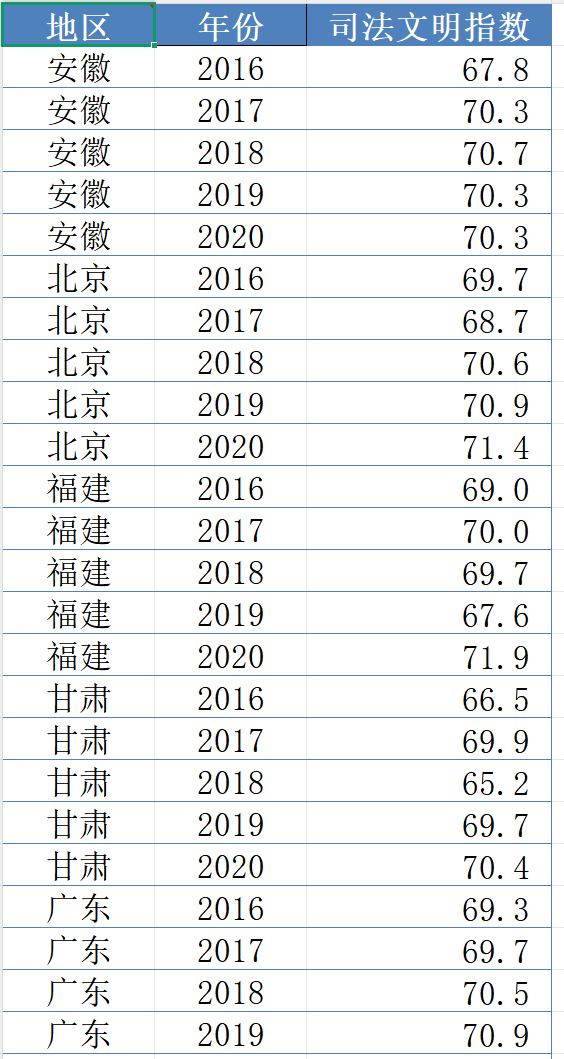 | 31省司法文明指数 | 2016 - 2020年 | 31个省份 | 面板数据,excel | xx社区用户 |