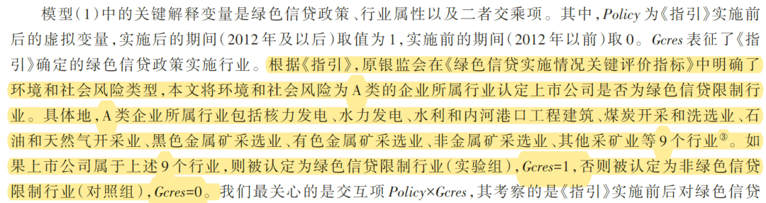 | DID指标 | Gcres*Policy,绿色信贷限制行业的企业在2012年之后赋值为1,否则为0 |